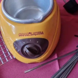 Macchina per sciogliere il cioccolato, ideale per creare dolci e praline. - Vaschetta in metallo. - Base in plastica. - Colore giallo e marrone. - Spatola - 12 forcine
