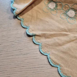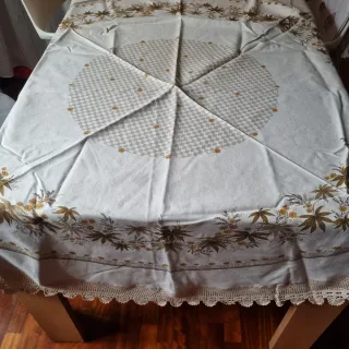 Elegante tovaglia rettangolare con un motivo floreale dipinto a mano. Aggiunge un tocco di colore e stile alla tua tavola. - Motivo floreale multicolore su sfondo beige. - Bordo rifinito con un motivo a uncinetto. - Dimensioni 160 x 130