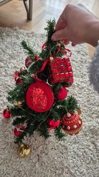Piccolo albero di Natale artificiale, perfetto per decorare piccoli spazi. - Rami in plastica. - Decorazioni rosse e dorate incluse. - Nastro rosso decorativo.