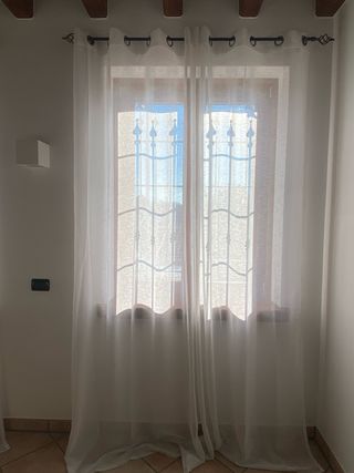 Tende a pannello trasparenti e bianche, perfette per arredare con leggerezza. - Coppia di tende. - Prezzo per totali 8 tende. - Anelli per un facile montaggio. Come nuove; usate poco e misura standard come in foto. Mai modificata perchè ho un nuovo tendaggi in casa. Misure 140x280cm circa IL PREZZO NON È INTESO CON I PALI