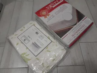 Set coprimaterasso matrimoniale con 1 coppia di federe abbinate. Il coprimaterasso è trapuntato. E le federe con zip - Misure coprimaterasso: 180x200 cm. - Fantasia aloe vera