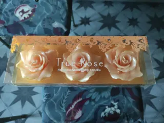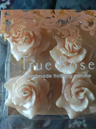 Set di quattro candele galleggianti a forma di rosa. - Design elegante a forma di rosa. - Colore rosa tenue perlato - in cera Realizzate a mano Dimensioni confezione 14x14x3.5 cm