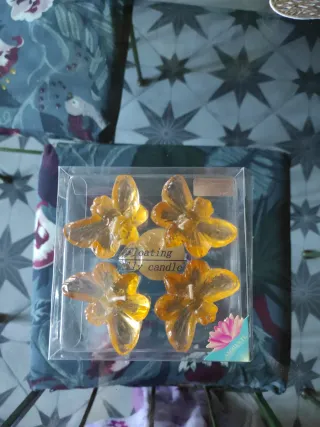 Set di 4 candele galleggianti a forma di fiore. - colore giallo trasparente - in gel Dimensioni confezione 13.5x13.5x2.5 cm