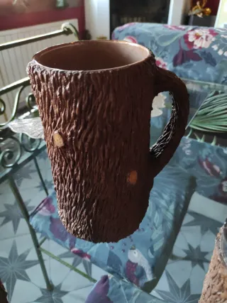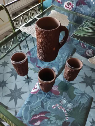 Set di tre bicchieri e una caraffa con un design rustico che ricorda la corteccia. - Caraffa con manico. - Bicchieri con finitura materica. Realizzati in resina e vetro all'interno Dimensioni caraffa: 11x11x21 cm Dimensioni bicchieri:6.5x6.5x13 cm