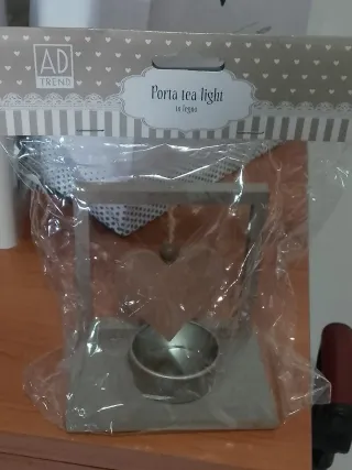 Porta tea light decorativo a forma di cuore. - Struttura in legno. - Dettaglio a forma di cuore sospeso. - Base in metallo per la candela.