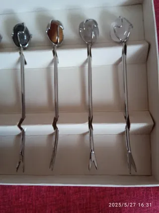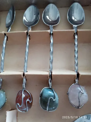 Elegante set di sette cucchiaini vintage, perfetti per aggiungere un tocco di originalità alla tua tavola. - Manici in metallo con design a spirale. - Terminali decorati con pietre naturali sfaccettate brasiliane - Ogni cucchiaino presenta una pietra diversa.