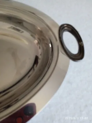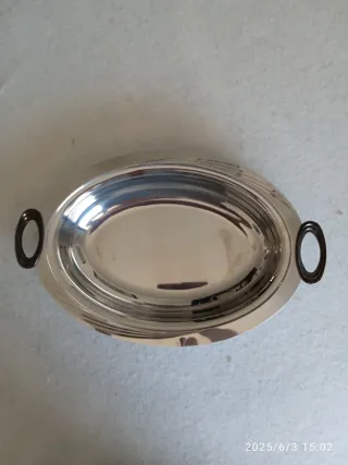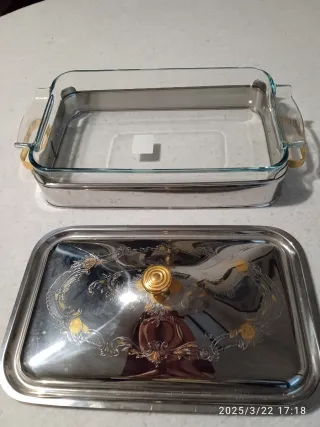 Elegante vassoio portavivande con contenitore in pirex. - Realizzato in metallo argentato. - Dettagli decorativi dorati sul coperchio. - Manici laterali per una presa sicura.