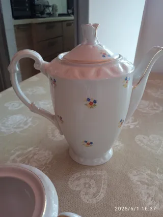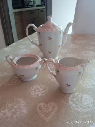 Elegante set di caffetteria composto da zuccheriera, lattiera e caffettiera, con un delicato decoro floreale. - Realizzato in porcellana di alta qualità. - Design classico con dettagli colorati. - Perfetto per aggiungere un tocco di raffinatezza alla tavola. ATTENZIONE: la zuccheriera non ha il coperchio