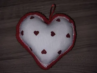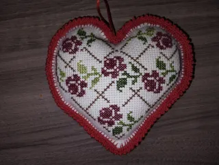 Delizioso cuore decorativo realizzato a mano con un motivo di rose. - Ricamo dettagliato su tessuto bianco. - Bordatura in crochet rosso vivace. - Perfetto come decorazione , puntaspilli , profumatore armadio o piccolo regalo. Spedizione veloce