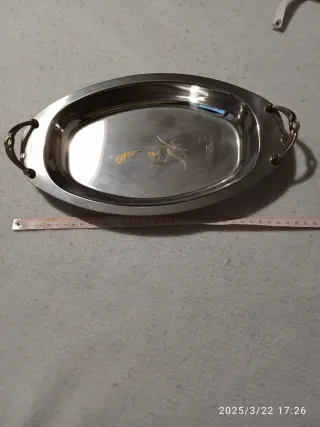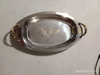 Elegante vassoio da portata in acciaio con un raffinato disegno dorato al centro e manici in tinta. Acciaio 18/10 + ORO 24 K - Misura vedi foto - Design ovale. - Manici curvi per una presa comoda. - Finitura lucida.