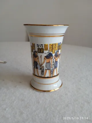 Elegante vaso in fine porcellana con decorazioni ispirate all'antico Egitto. - Motivi egizi dettagliati. - Bordi e dettagli in oro. - Finitura bianca lucida.