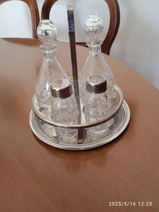 Elegante set per olio e sale in stile vintage, perfetto per la tavola. - Due bottiglie con tappo per olio o aceto. - Due saliere con coperchio forato. - Struttura di supporto in metallo argentato. - Vetreria decorata con motivi a rombi.