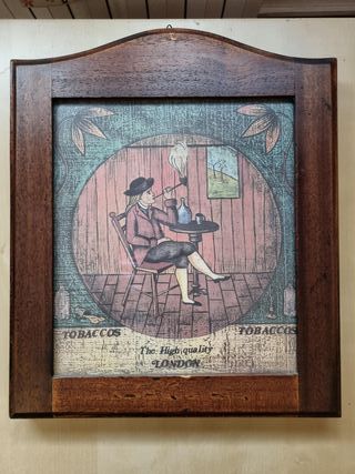 quattro stampe artistiche con cornice il legno legno scuro invecchiato . Illustrazione in stile vintage che raffigurano uomini , navi e mari La stampa ha un aspetto invecchiato o rustico, che si abbina al materiale del supporto. Si tratta di un oggetto decorativo da collezione o d'arredamento per gli amanti del tabacco o dello stile nautico/vintage. misure 36 x 31 cm