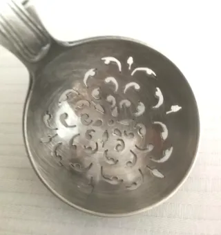 Elegante cucchiaio da zucchero risalente all'epoca vittoriana. - Design traforato con motivo floreale. - Manico decorato.