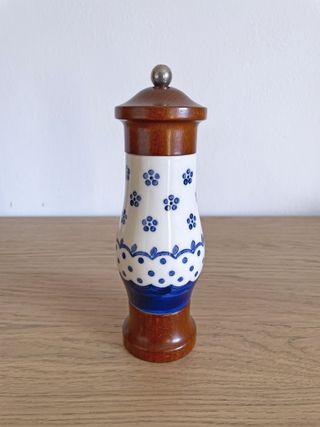 Macina spezie sale pepe Dimensioni: 21,5 cm circa altezza 6,5 cm circa diametro Peso: 390 gr circa Sono presenti alcune imperfezioni negli elementi in legno e dovuti alla natura del materiale e alla tecnica di realizzazione. La ceramica presenta una macchia marrone visibile nella foto 20, macchia da contatto con l'elemento di legno.Elegante macina spezie Bisetti, un pezzo unico per la tua cucina. - Realizzato in Italia. - Combinazione di legno e ceramica decorata. - Dettagli floreali blu su base bianca.