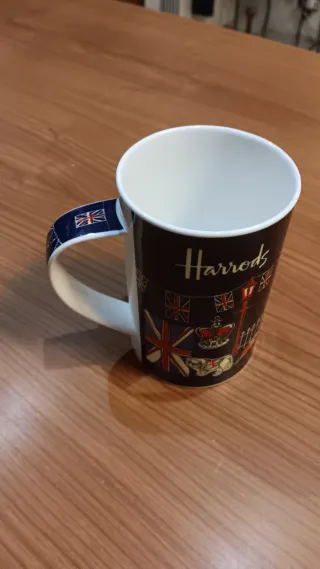 Tazza in porcellana con design a tema Londra. - Raffigurazione di un autobus rosso a due piani e architetture tipiche. - Bandiere del Regno Unito decorate sul manico e sul corpo della tazza. - Logo Harrods con corona sul bordo interno.