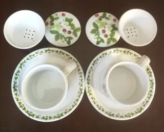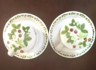 Set di tazze e piattini in ceramica con un grazioso motivo floreale di fragole. - Design inglese. - Motivo di fragole e fiori. - Bordo decorato con foglioline verdi.