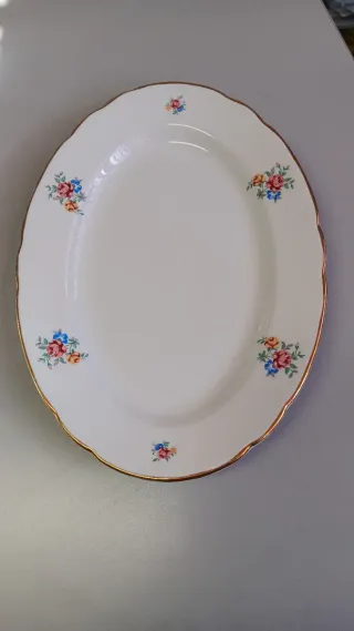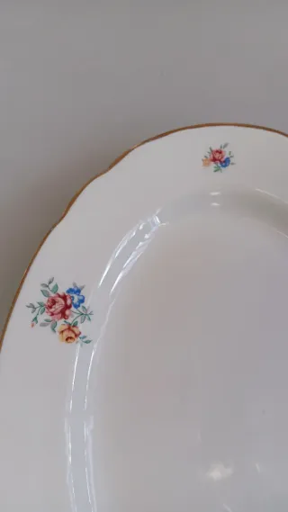Elegante piatto da portata Richard Ginori con un delicato motivo floreale. Piccole imperfezioni riga oro bordo e baffo scuro nel retro. Cm. 31x23,5 - Bordo ondulato con finitura dorata. - Decorazione floreale multicolore. - Realizzato in porcellana di alta qualità.