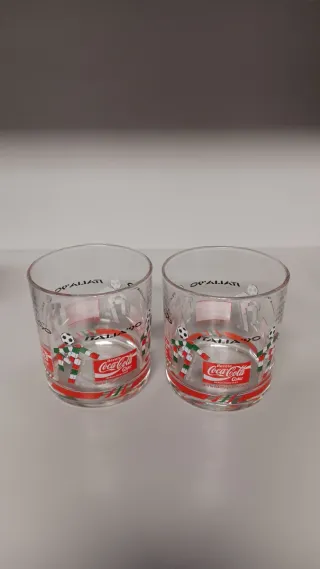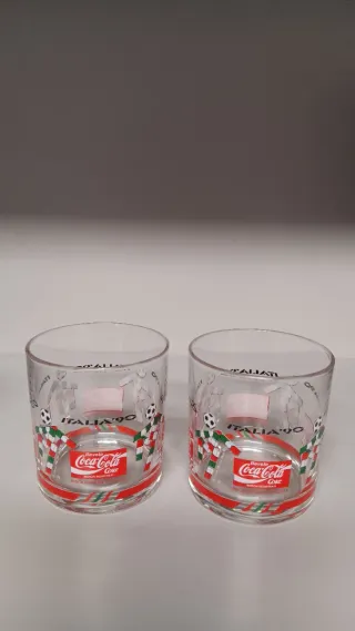 Set di due bicchieri da collezione Coca-Cola, dedicati ai Mondiali di calcio Italia '90. Presentano un design a tema calcistico con giocatori stilizzati e i colori della bandiera italiana. - Edizione speciale Italia '90. - Decorazione con tema calcistico.