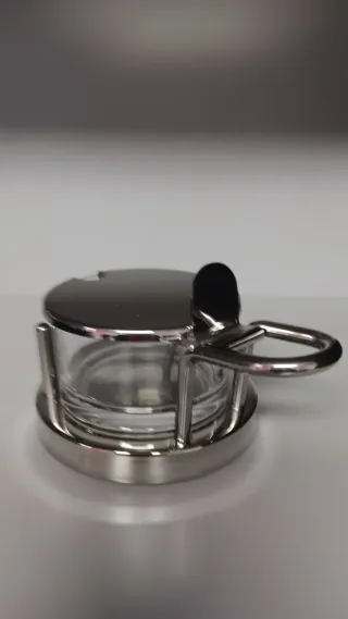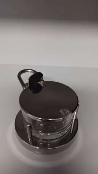Elegante formaggiera Alessi con un design moderno. - Qualche piccolissimo graffio. - Base rotonda in metallo. - Contenitore in vetro trasparente. - Coperchio in metallo con manico ad anello.