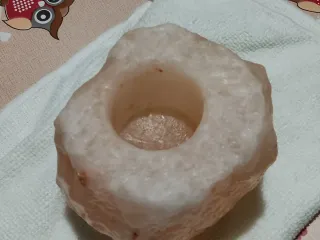 Elegante porta candela realizzato in sale rosa naturale. La sua forma grezza e irregolare lo rende un pezzo unico. - Materiale: sale rosa Himalaya - Colore: rosa tenue.