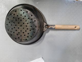 Padella in metallo con manico in legno, ideale per cuocere le castagne. - Design forato per una cottura uniforme. - Manico in legno per una presa comoda.