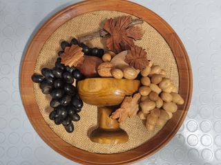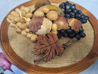 Bellissimo quadro decorativo tridimensionale con tema natura. - Realizzato in legno intagliato. - Base in juta. - Rappresenta un cesto di frutta con uva, noci e foglie. - Cornice in legno.