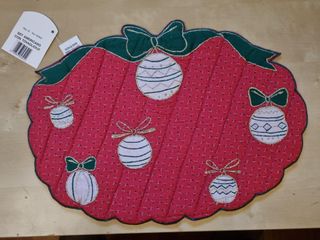 Elegante set americano con tovagliolo, perfetto per la tavola delle feste. - Design a tema natalizio con palline e fiocchi. - Bordi rossi e dorati. - Imbottitura per una maggiore consistenza.