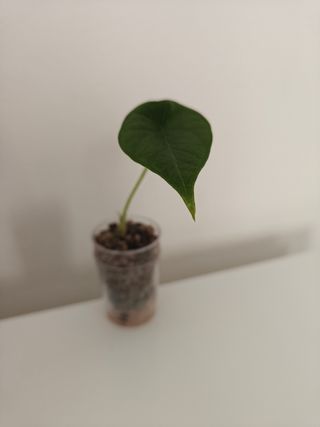 Pianta di Alocasia Melo Maharani, con una foglia verde scuro. - Foglia a forma di cuore. - Cresciuta in vaso trasparente con substrato misto. Possibilità di acquistarne anche più di una.