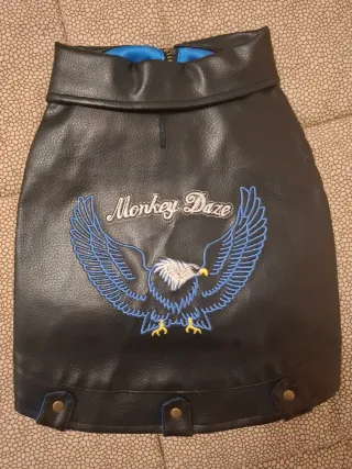 Cappottino per cane in similpelle con ricamo di un'aquila e scritta Monkey Daze. - Chiusura con cerniera. - Fodera interna azzurra. - Dettagli con bottoni a pressione sul fondo.Cerniera da sistemare.Mai usato