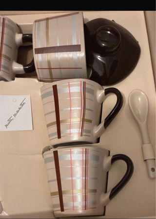 Elegante set colazione con piattini abbinati, perfette per ogni occasione. - Design a quadri con dettagli a righe. - Manici neri. Edizione limitata e certificata Marta Marzotto
