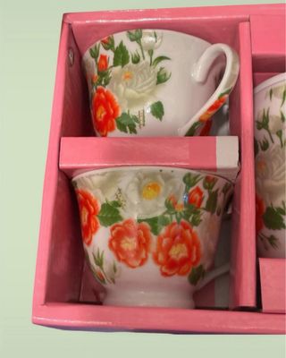 Elegante set per la colazione con un vivace motivo floreale. - Decorato con fiori rossi e bianchi. - Realizzato in porcellana di alta qualità. - Include tazze e piattini.