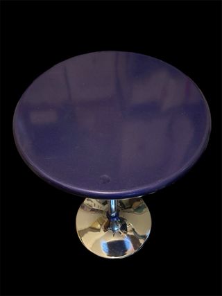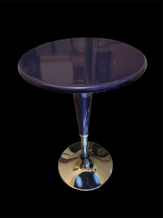 Elegante tavolino da bar dal design vintage. La base cromata riflette la luce creando un piacevole effetto. - Piano rotondo in finitura blu. - Gamba centrale affusolata. - Base ampia e stabile in metallo lucido.