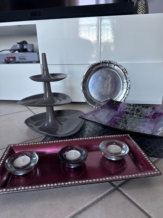 Bellissimo set decorativo per la tua cucina! Perfetto per aggiungere un tocco di stile e raffinatezza. - Include portacandele, vassoio e alzatina. - Eleganti dettagli in argento. - Design moderno e accattivante.
