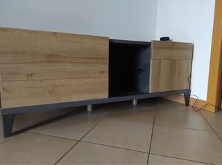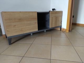Mobile porta TV con un design moderno che unisce finiture in legno e dettagli grigio fumo. - Struttura in metallo. - Ripiano interno in vetro.