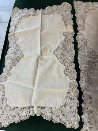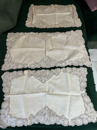 Set di tre centrini decorativi con un elegante bordo in pizzo. - Design floreale raffinato. - Realizzati in tessuto di lino. Cotone linizzato