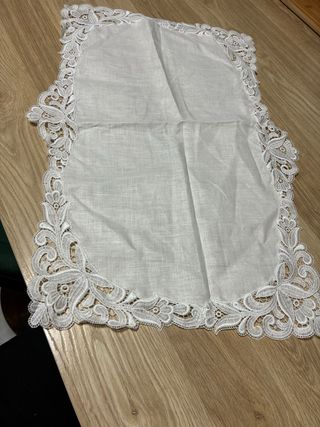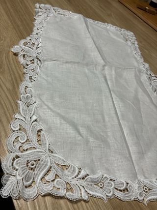 Elegante centro in tessuto con un raffinato bordo in pizzo. - Design floreale sul bordo. - Finitura in pizzo lavorato. Cotone linizzato Misura 57x34