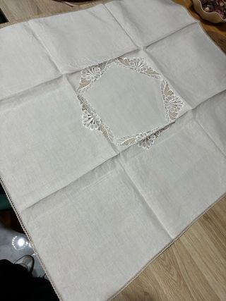 Elegante centrotavola con dettagli in pizzo. - Realizzato in tessuto di lino. - Colore beige . - Decorazione floreale in pizzo sul bordo. Cotone linizzato Misura 82x78