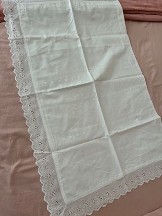 Federa per cuscino in tessuto bianco, rifinita con un elegante bordo in pizzo floreale. - Dettagli in pizzo su entrambi i lati. - Motivo traforato a fiorellini sul tessuto. Misura 76x44 senza considerare il merletto