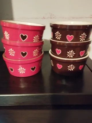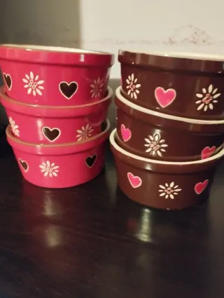 Set di 6 ciotoline in ceramica Villa d'Este, perfette per servire o decorare. - Design con cuori e fiori. - Colore esterno marrone e interno bianco. - Colore esterno rosso e interno bianco.