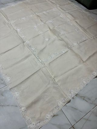 Elegante tovaglia da tavola con un delicato bordo in pizzo. - Motivo floreale sul pizzo. - Tessuto cotone linizzato alta qualità. Misura 170x170