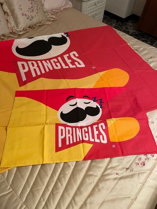 Bellissimo set Pringles con lenzuolo singolo e federa per cuscino. Bellissimo lenzuolo + federa cuscino Pringles Misure lenzuolo 155x290 cm Federa cuscino 50x80 cm Ottima qualità,100% cotone Mai usato - Design iconico Pringles con il personaggio addormentato. - Colori vivaci rosso e giallo. - Tessuto morbido e confortevole.