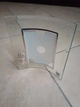 Elegante cornice portafoto in vetro con un design moderno e curvo. Presenta due graziose decorazioni floreali in rilievo sul lato sinistro in argento. - Materiale: Vetro e metallo - Decorazioni: Floreali in rilievo - Design: Curvo