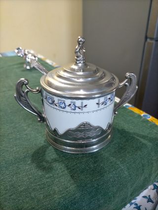 Elegante zuccheriera vintage risalente agli anni '50, un pezzo d'epoca che aggiunge un tocco di classe alla tua tavola. - Design raffinato con dettagli floreali. - Base e manici in metallo lavorato. - Coperchio con pomello decorativo.