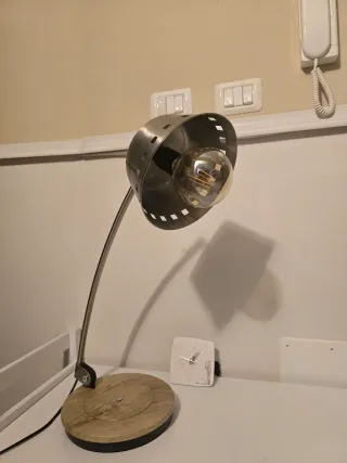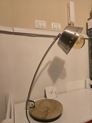 Lampada da tavolo dal design moderno e industriale, perfetta per aggiungere un tocco di stile a qualsiasi ambiente. - Struttura in metallo e base rivestita in legno. - Finitura bicolore argento e marrone.
