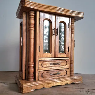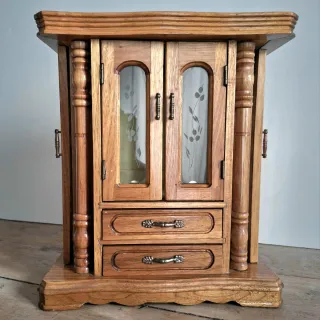 Mini mobiletto in vero legno di rovere (scala 1:5), perfetto come oggetto decorativo, da collezione o come porta-gioielli. Dimensioni: 30 cm (h), 27 cm (largh.), 13 cm (prof.). Struttura in rovere massello e impiallacciato, stile rustico/classico. Porte con vetri decorati, due cassetti funzionanti, laterali con vellutino avorio per anelli e orecchini (in ottime condizioni). Solido, pesante, ben rifinito e pulito. Pezzo unico, ideale per chi ama i mobili in scala o gli oggetti decorativi di qualità.