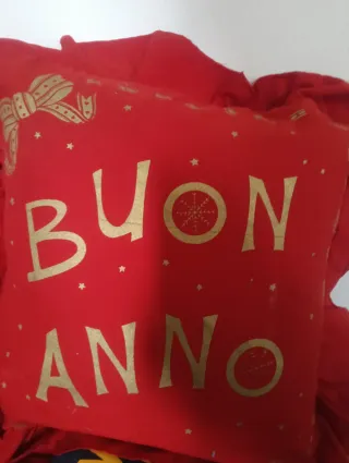 Set di due cuscini decorativi rossi con la scritta Buon Anno in color oro. Perfetti per aggiungere un tocco festivo alla tua casa durante le feste. - Design con fiocchi e campanelle. - Decorati con piccole stelle. - Tessuto morbido al tatto.