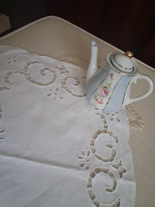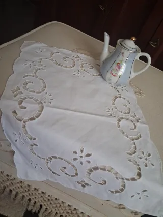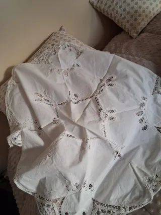 Bellissima tovaglia realizzata a mano, un pezzo unico che porta con sé il fascino della tradizione. Realizzata e ricamata a mano - Design floreale con dettagli traforati. - Bordi rifiniti con pizzo. - Ideale per occasioni speciali o per dare un tocco vintage alla tavola.