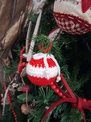 Set di due palline natalizie realizzate a mano all'uncinetto. Perfette per decorare il tuo albero di Natale con un tocco artigianale. - Design a righe rosse e bianche. - Realizzate in lana
