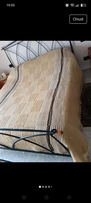 Antichissima coperta realizzata al telaio con filo di ginestra e cotone. È formata da 3 teli uniti. Le misure sono 250cm x 170cm. Presenta dei piccoli difetti come da foto, dati dal secolo di età e dagli anni passati stipata in un baule